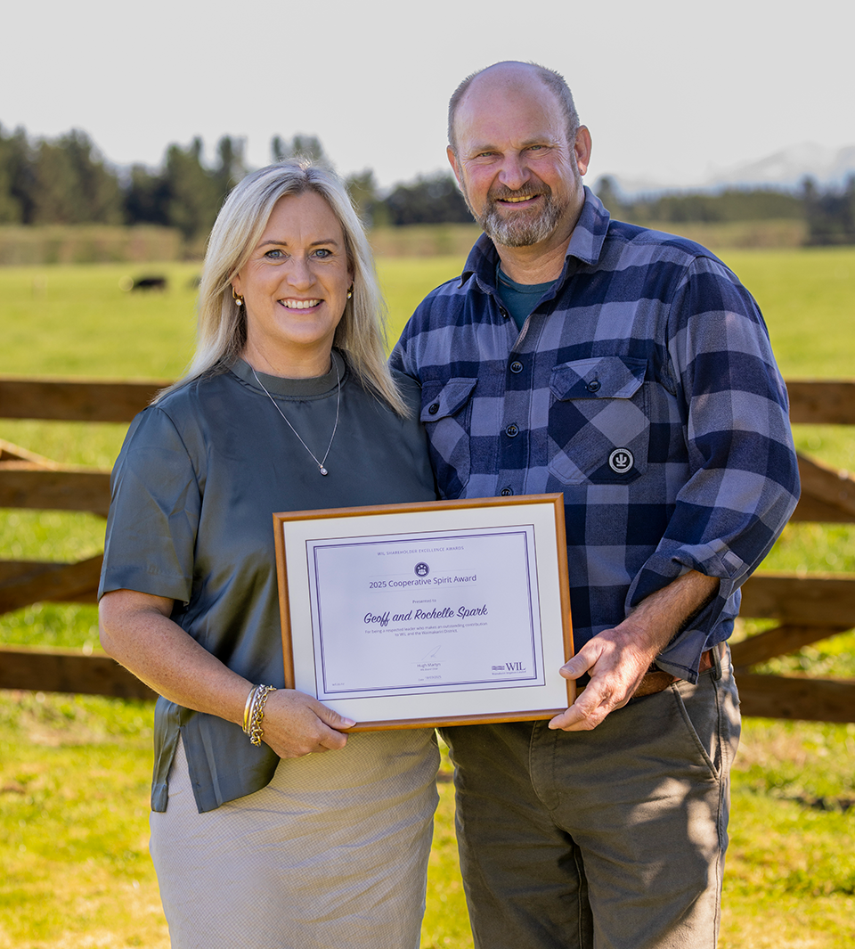 Oxford farmers Geoff and Rochelle Spark recently won the Cooperative Spirit Award at Waimakariri Irrigation’s (WIL’s) 2025 Shareholder Excellence Awards for their ongoing efforts to foster positive connections between rural and urban residents.